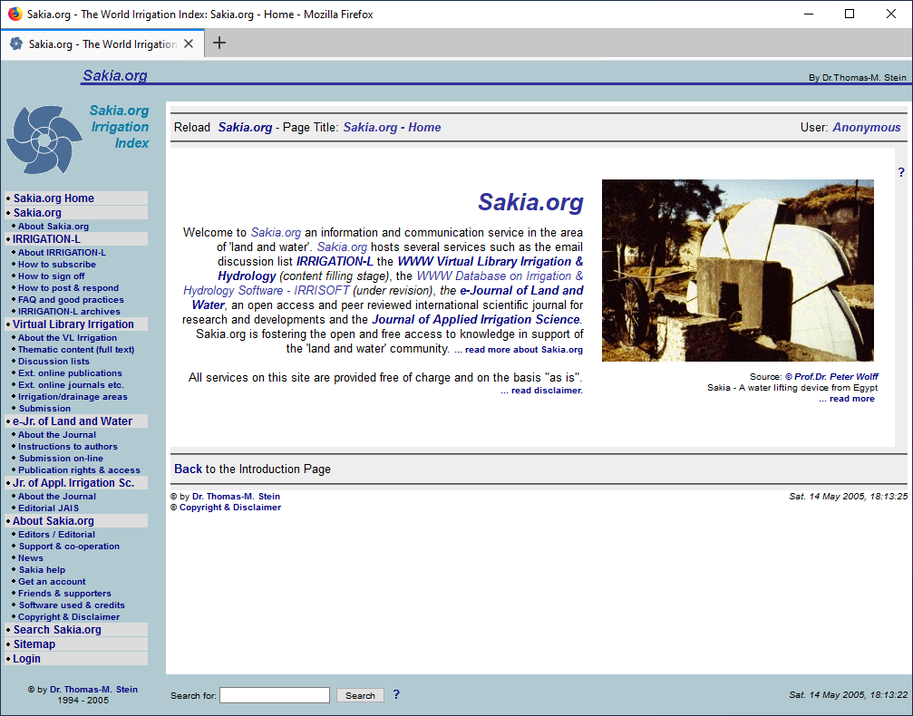 In 2001 and 2002, initial preparations were undertaken, and in 2003 a renewed attempt was made to reactivate the services. Significant time and funding were invested in rebuilding Sakia.org. A dedicated, stand-alone server was established, allowing the independent continuation of services for the agricultural water and irrigation community. In October 2003, the first Sakia.org modules were launched and released to the public.